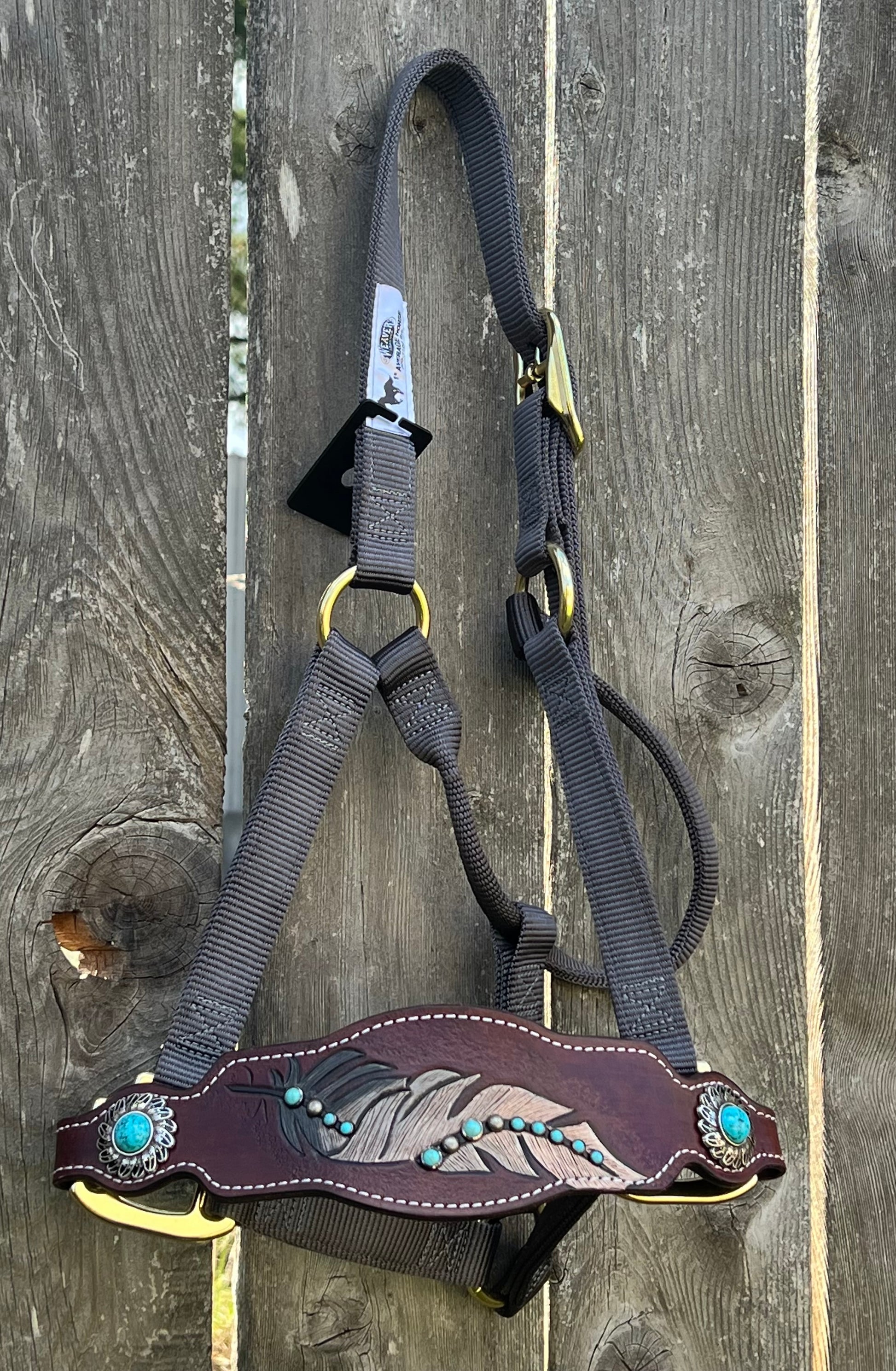 Our handmade leather halters are meticulously crafted from genuine leather, ensuring superior durability. Our halters are both functional and stylish, making them a timeless investment for any equine enthusiast. This twisted feather noseband is attached to a Gray Weaver nylon Average sized halter that fits horses up to 1000 pounds. The leather nosebands are not sewn to the halters so that they can removed and placed on another halter easily.